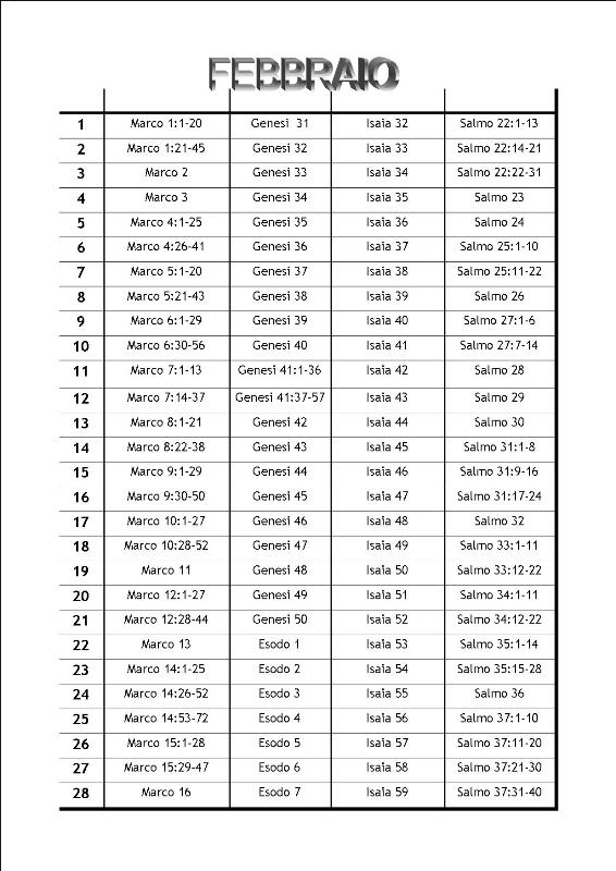 In basso troverai 12 immagini JPG, una per ogni mese dell'anno. Si tratta di tabelle con i giorni del mese: accanto ad ogni giorno vi sono una serie di passi biblici da leggere: se li seguirai fedelmente, alla fine dell'anno avrai letto tutta la Bibbia.